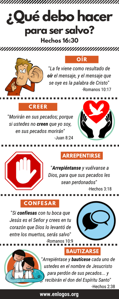 Ya conoce que el Evangelio son las buenas noticias de la muerte, sepultura y resurrección de Jesús. Ahora está listo (a) para aceptar a Jesús en la forma bíblica, la aprobada por Dios. No necesita repetir la «oración del pecador«, sino seguir el plan de la Biblia para ser salvo. En la siguiente ilustración se presentan los pasos para aceptar a Jesús de la forma escritural y recibir la salvación: